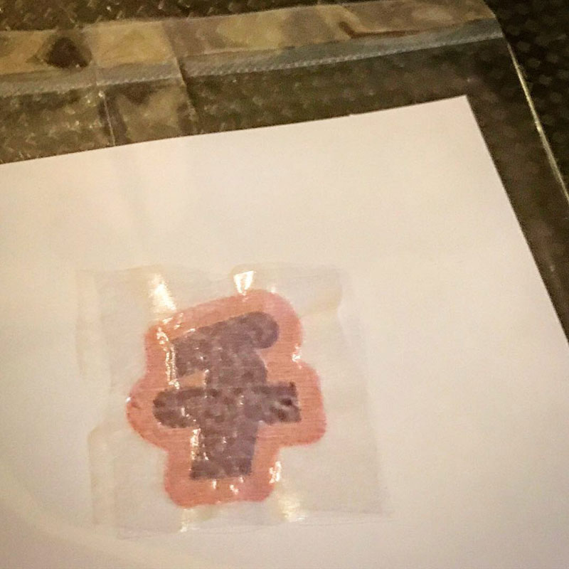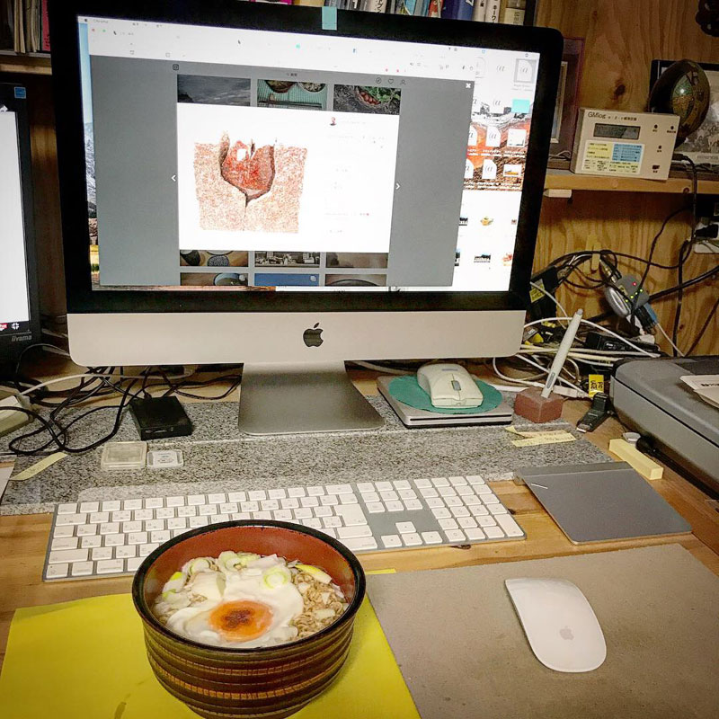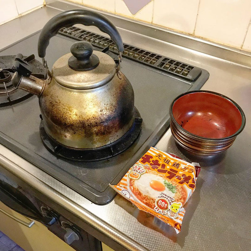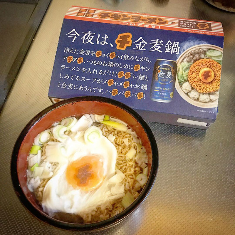 お湯沸かして即席麺。卵に「チ」の字の食べられるシール。