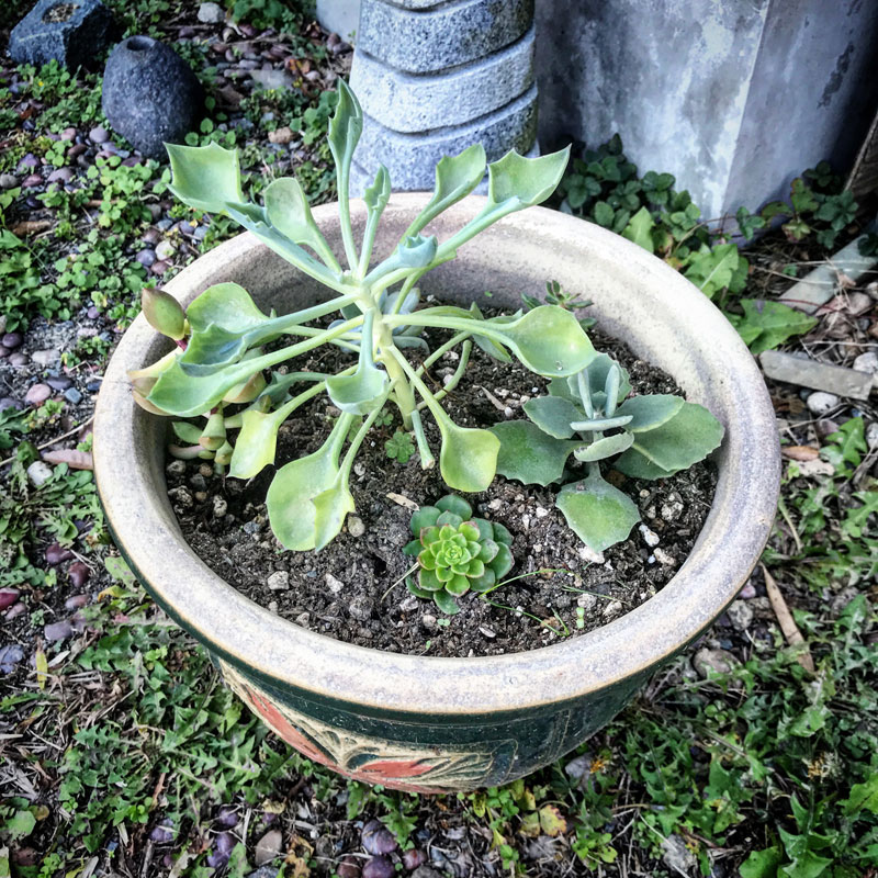 今度の個展で石の花器と組み合わせるために用意した多肉植物。使い切れなかった分を鉢に寄せ植え。室内に入れて冬越しするための準備。