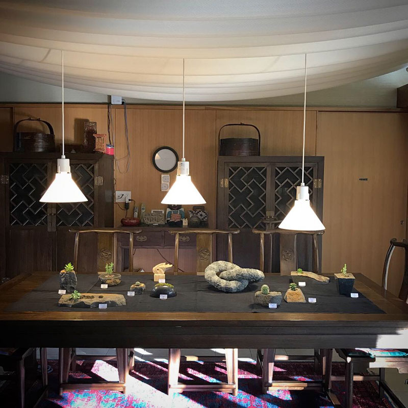居間のテーブルには伊達冠石の花器。