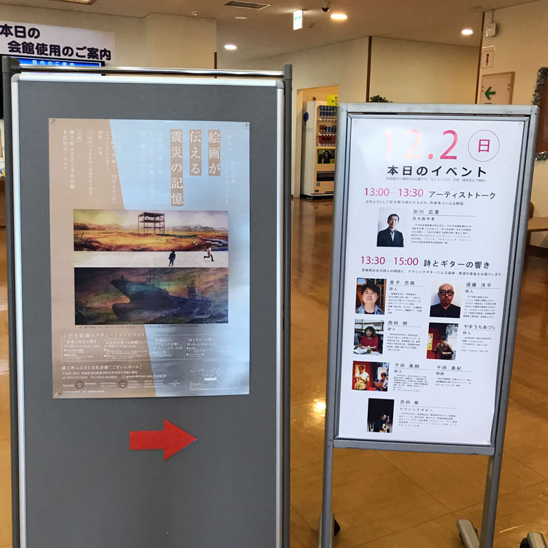 蔵王のございんホールへ。加川広重さんの「絵画が伝える震災の記憶」を見にきた。