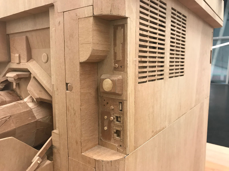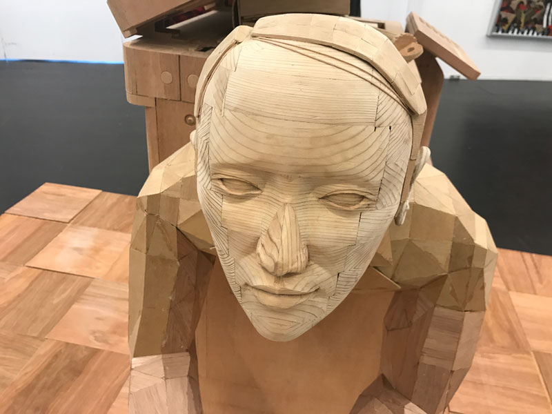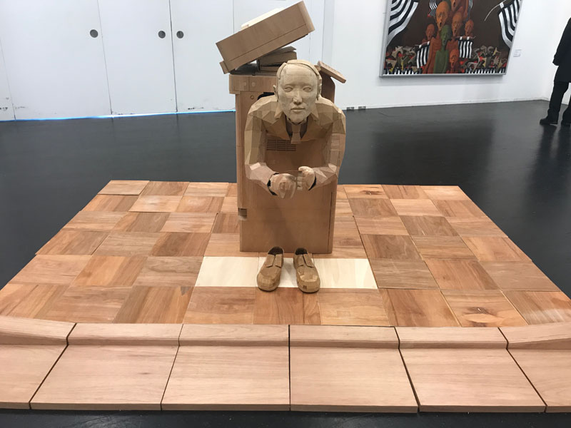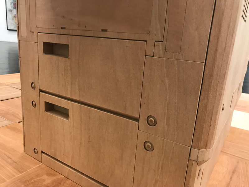 角材とベニヤ板だけで作られた立体作品。タイトルは「バスに乗り遅れるな」