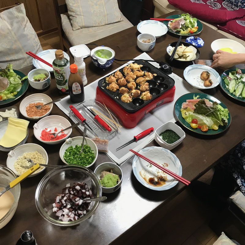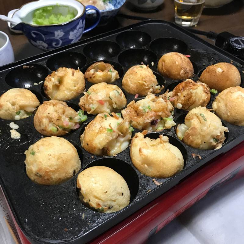 焼きは担当します。が、我が家のはガスレンジに乗せる鉄のタイプ。電気の温度がわからないので1回目は火が強すぎてうまく珠にならないものもあったけどご愛嬌。美味しかったから良いのです。このタコは中原中也賞を受賞した須藤洋平さんが最新の詩集「赤い内壁」を発行した西田朋さんに送ってきたもの。ご相伴にあずかります。ごちそうさまです。