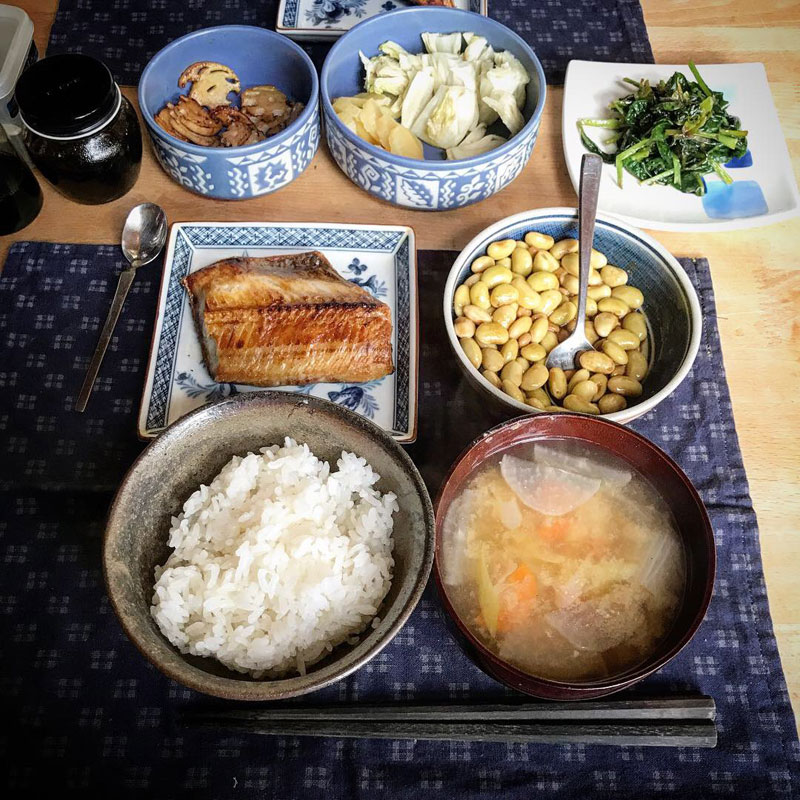 昼食。手作りの青豆納豆、ほっけ。