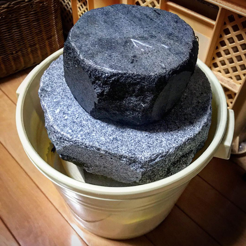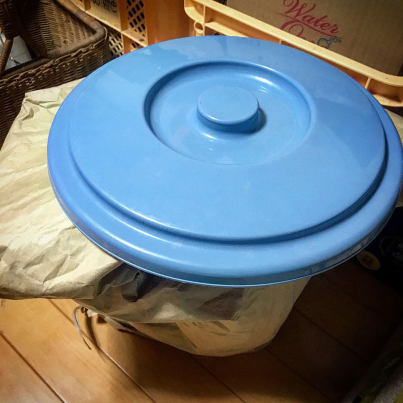 重石3つ重ねると蓋ができないので米袋をホコリよけにかぶせておく。