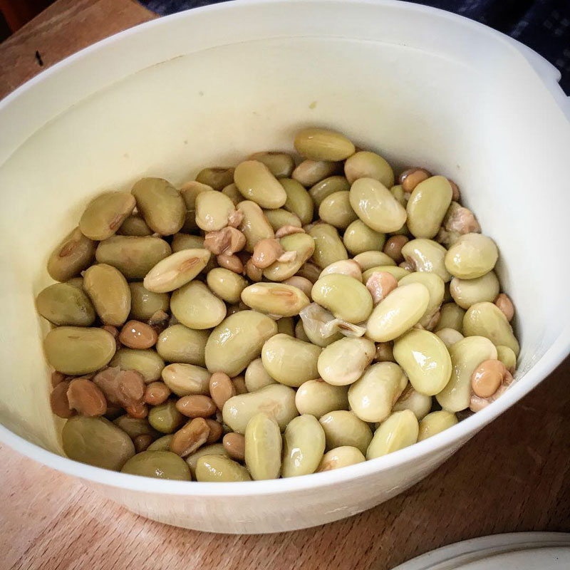 昼飯に家に戻る。青豆納豆仕込んでおいた。今回は藁や納豆菌を用意するんじゃ無くて市販の納豆と混ぜてランチジャーで一日保温しただけ。