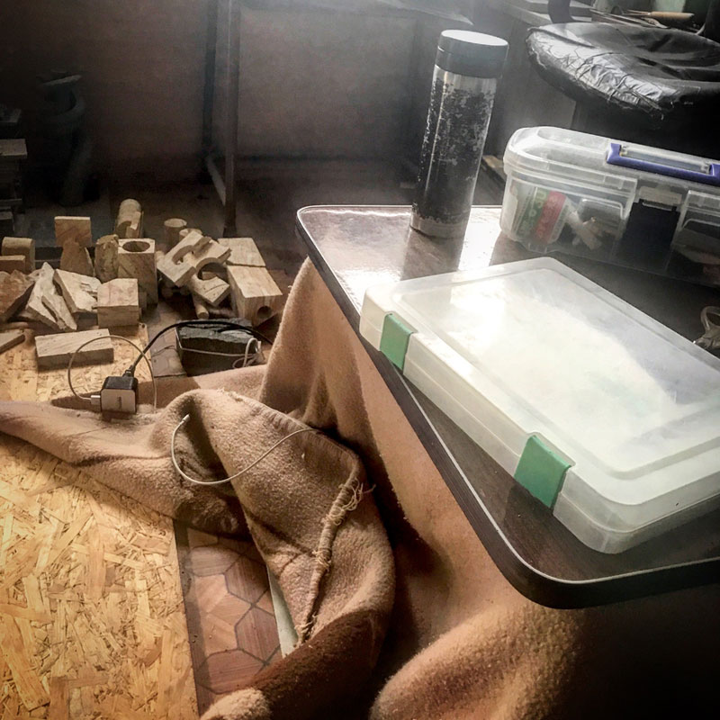 真冬は寒くて iPhoneのバッテリーフル充電してあっても0%に落ちるし、記録用に制作過程をこまめに撮ってるコンデジも充電してあっても電池切れになってしまうから、冷え切ってしまわない様にプレハブ小屋に持ってきた古いコタツの中に入れておく。昨日はめちゃくちゃ冷えてそれでも撮影している間にどんどんバッテリー量のゲージが下がった。寒さはいちいち面倒くさい。早く春が来ないかなぁ。