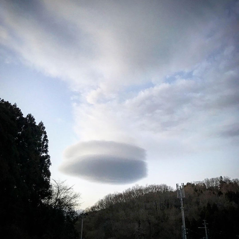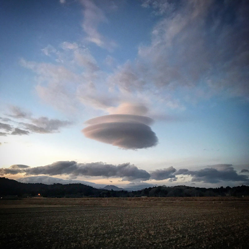 仕事を終えて帰ろうと思った時に、仕事場の上に浮かんでた。なんだ、この雲。まるでどら焼き。