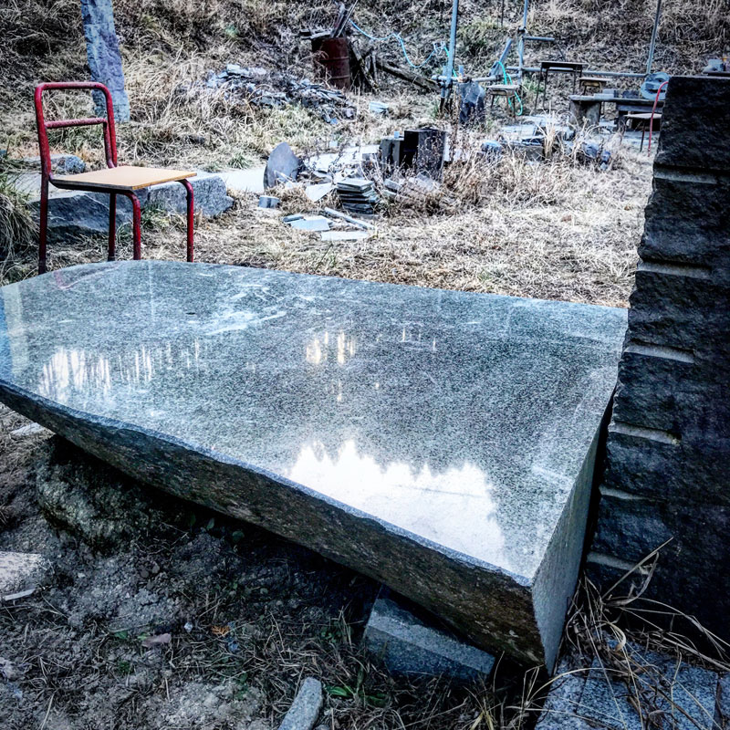 山の木々の間から漏れる日の光が石のテーブルに映ってる。この山の陰になるから仕事場は午後陽が当たらなくて寒い、寒い。今日もまた強い風が吹いてきた。