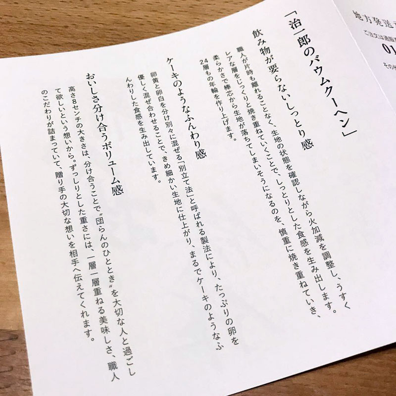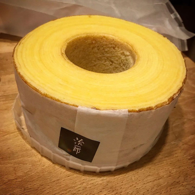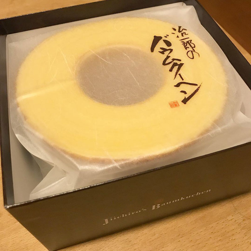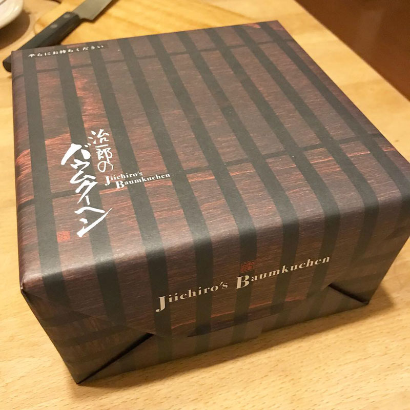 治一郎の「飲み物が要らないしっとり感」「ケーキのようなふんわり感」「おいしさ分け合うボリューム感」のバウムクーヘン、いただいた。