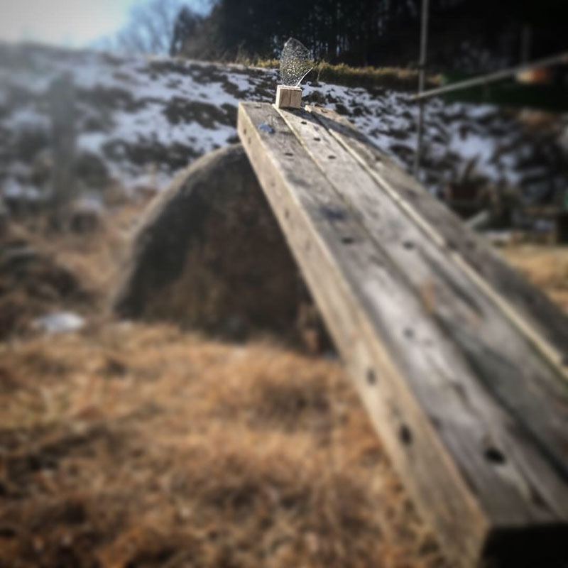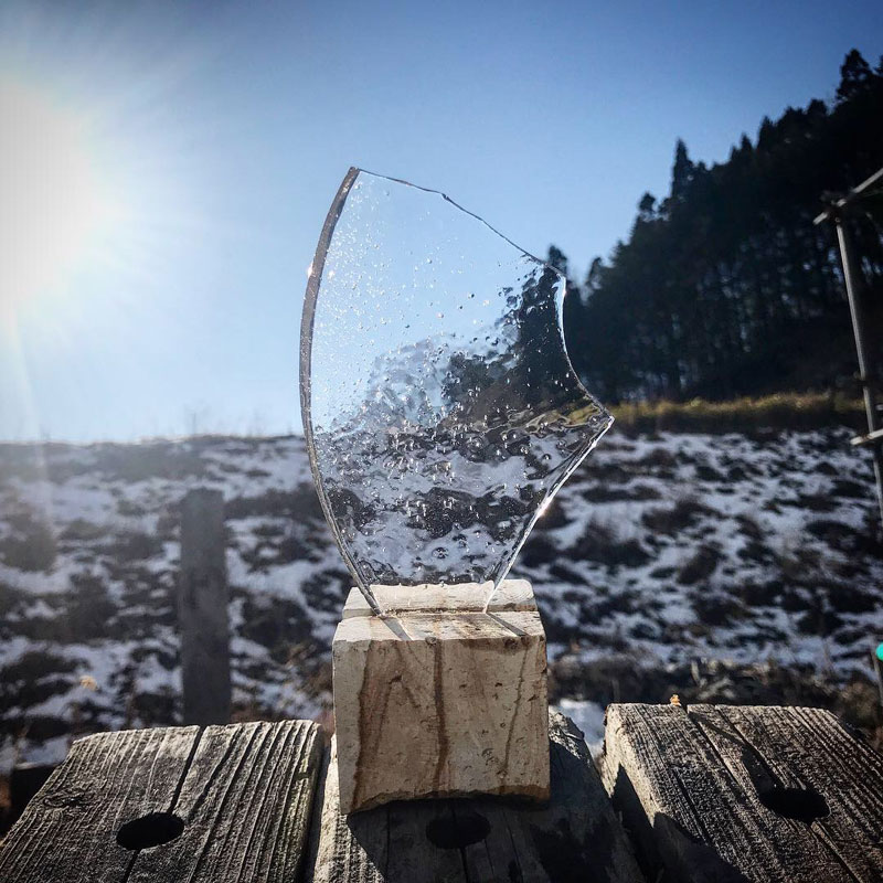 木の上に切り込みを入れた天草木目石を置いて氷をはさんだ。
