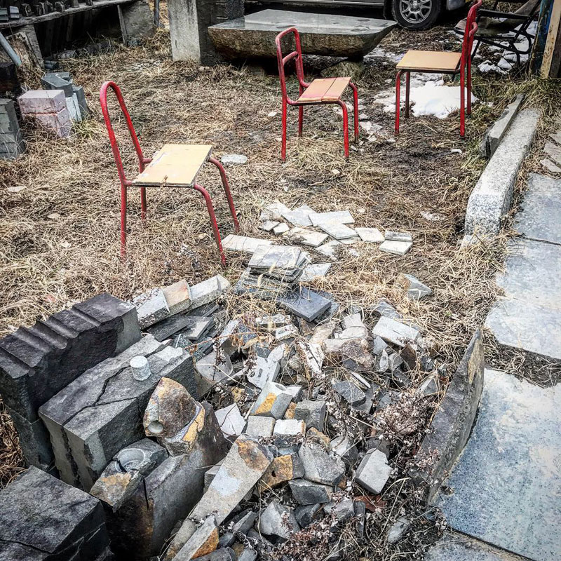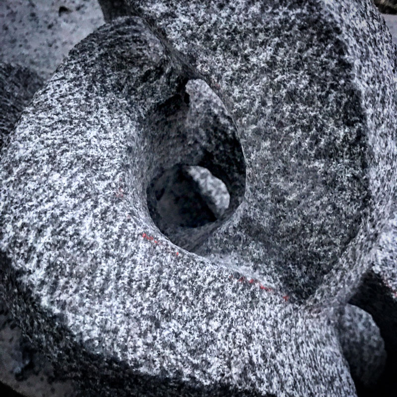 昨日の夕方、あっちから彫ったところとこっちから彫ったところが貫通して点のような穴が開いたところをφ4cmくらいまで広げた。手前にある部分をかいくぐる様に。他のところも彫りながらだけど丸一日かかった。1月中の完成を目指していたけど大詰めに来て苦戦。それでも細い帯が絡まったような繊細な形。今日も石彫りの振動に負けずに折れないでいてくれた事に感謝。