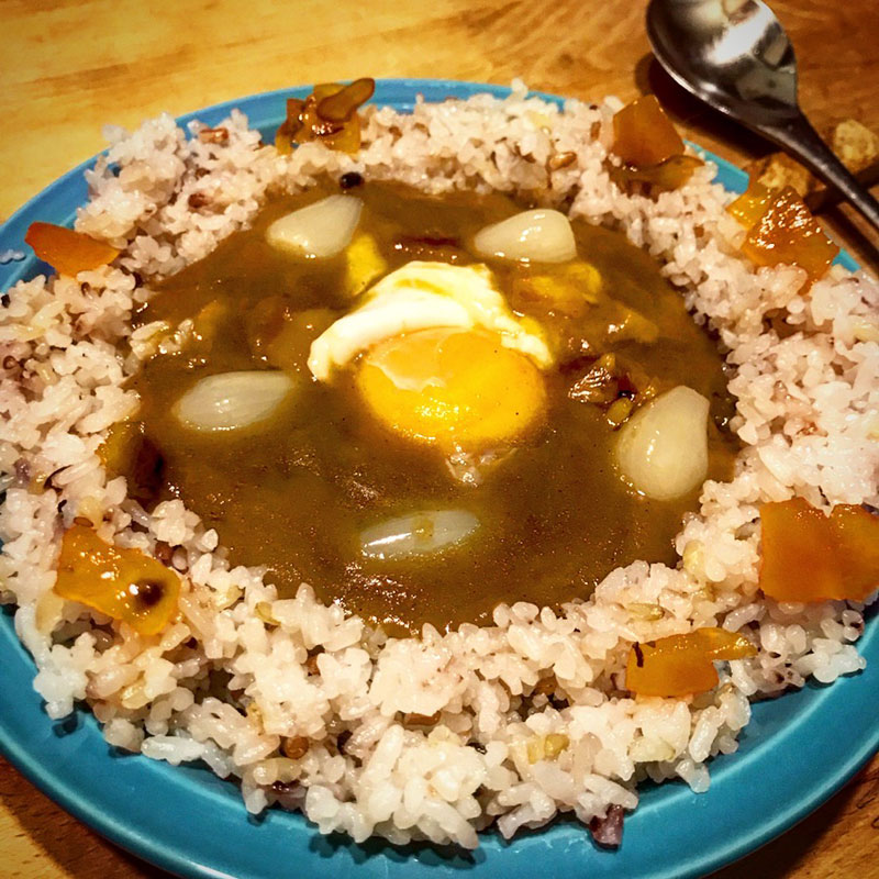 休肝日。カレーライスの夕食。色米を少し混ぜて炊いた”東北194号”米をドーナツ状によそって中にカレー。ポーチ・ド・エッグを真ん中に落として、らっきょうと福神漬け散らした。特に意味は無いし美味しさも変わりませんが何か?