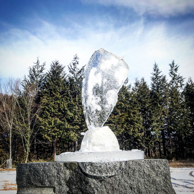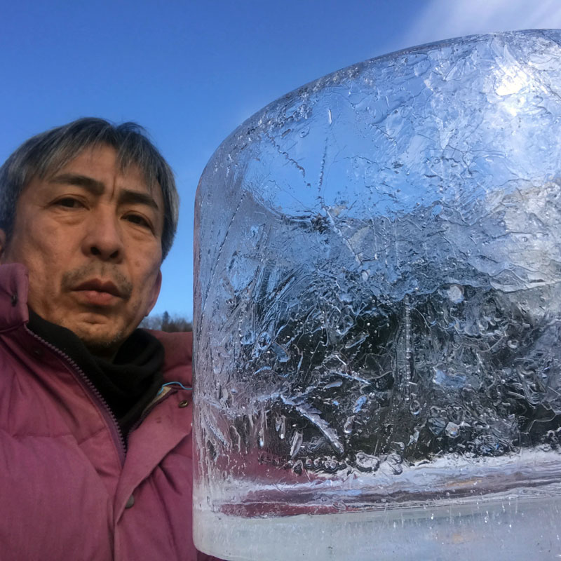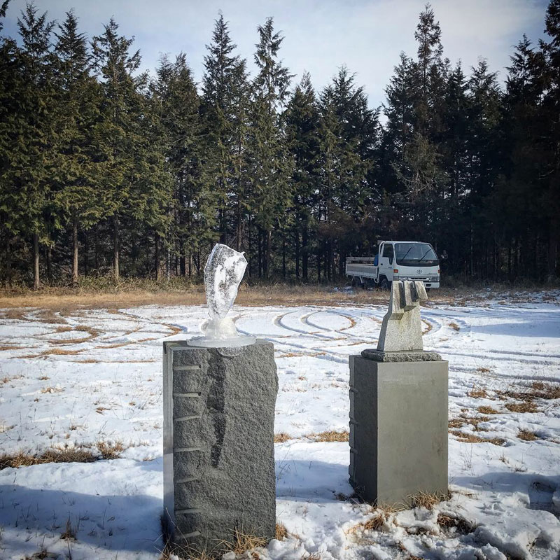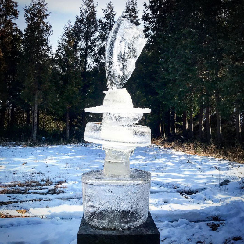 氷をいくつも重ねて氷のオブジェ。滑らないように間に雪を挟んでます。