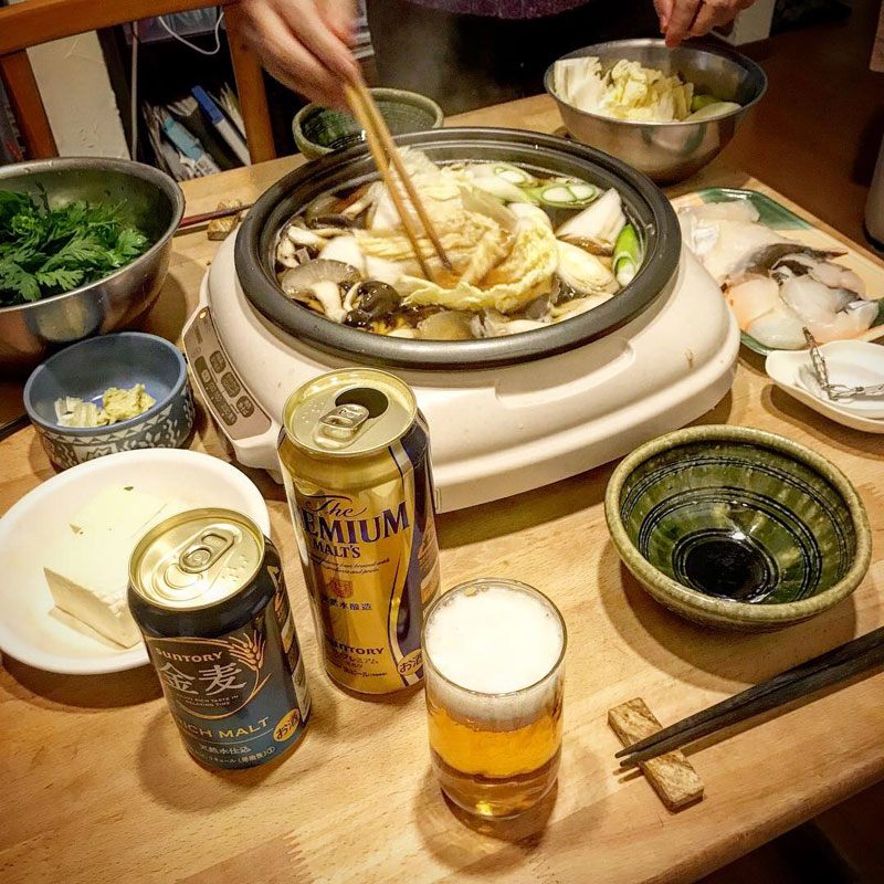 居酒屋我家、開店。鱈鍋。一本目はいただいたプレミアムモルツ、次からは金麦。