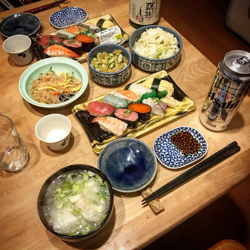 カミさんと僕の実家での美味しくて楽しい正月でした。戻ってきた地元は雪が無くて良かった。また石彫りの日常が始まる。スーパーの500円のお寿司で居酒屋我家、開店。