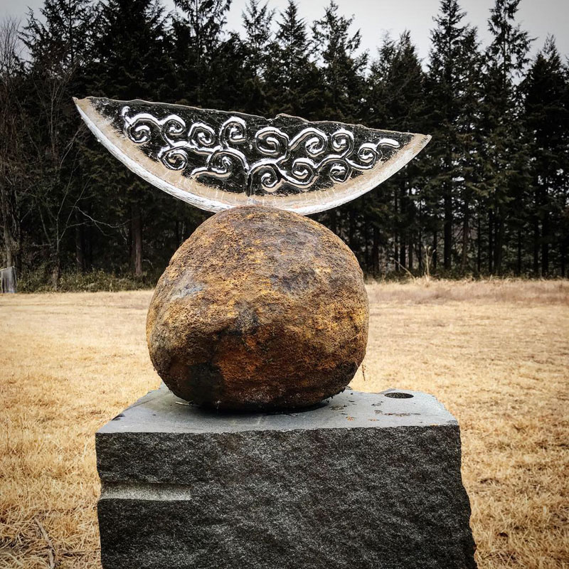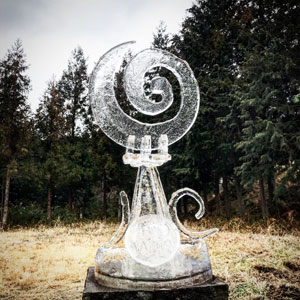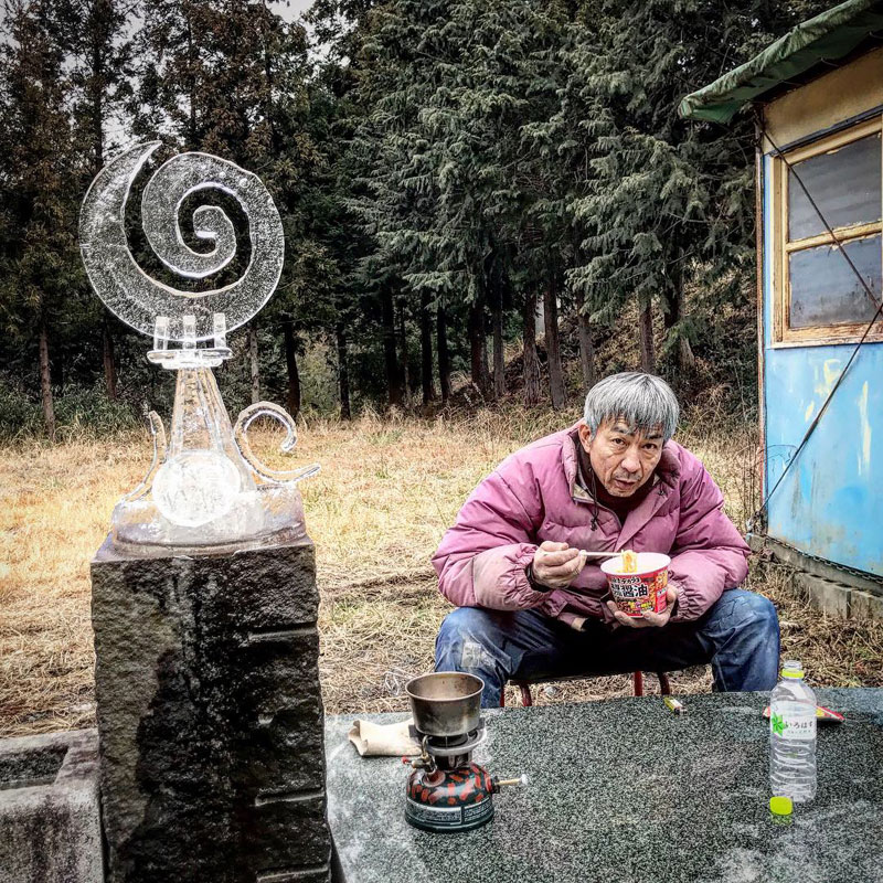 もっと彫りたい。作品のすき間から今朝作った氷のオブジェ覗いてみる。