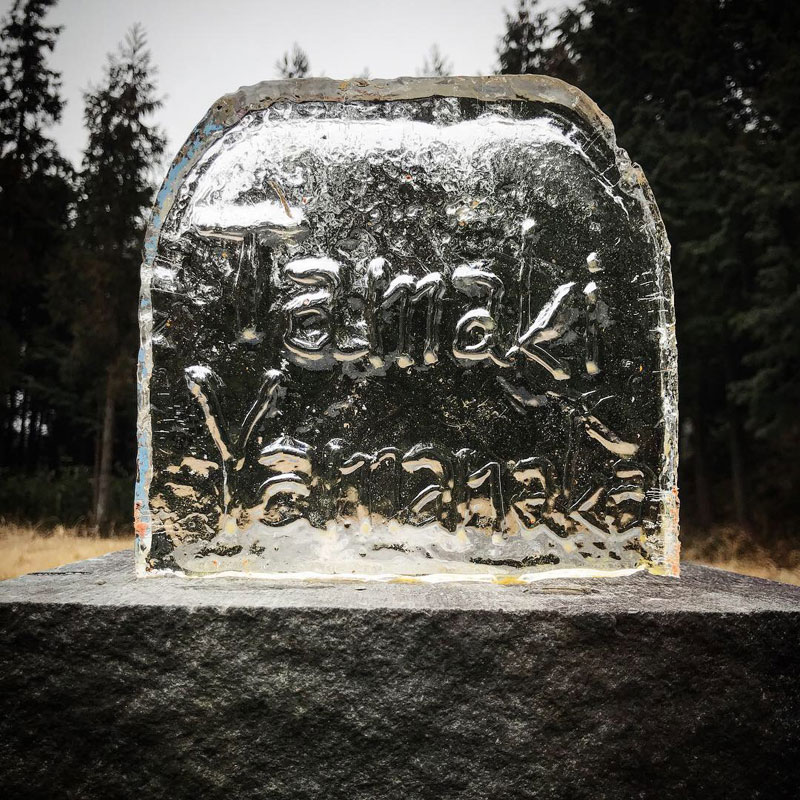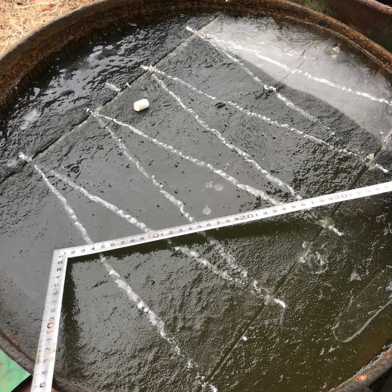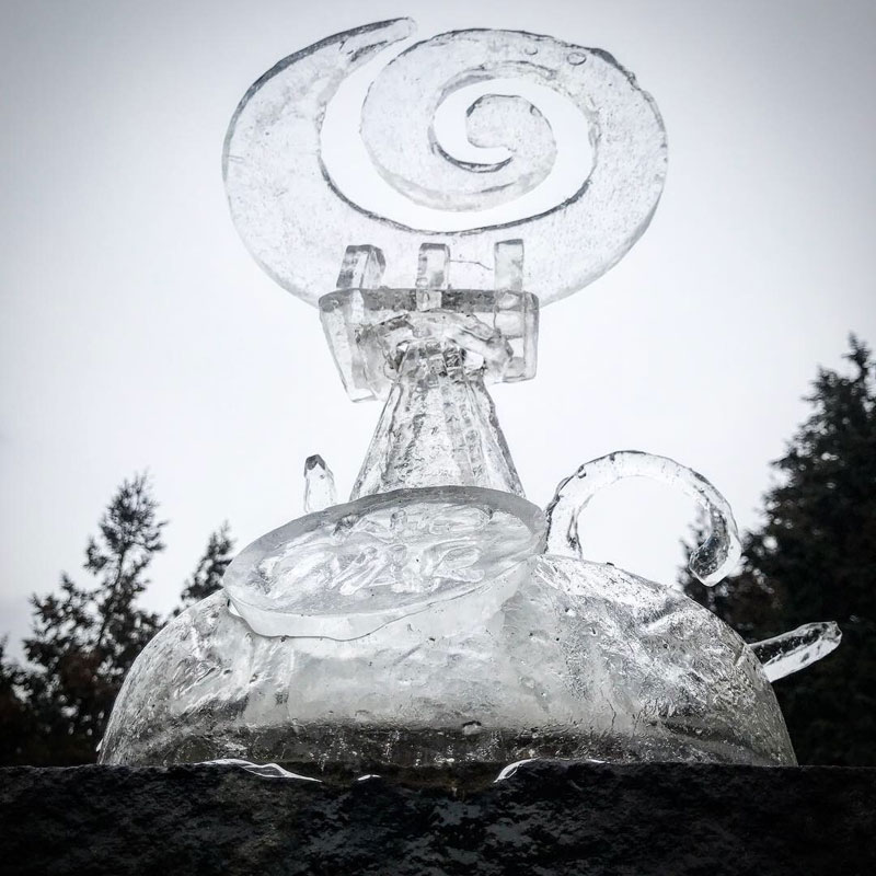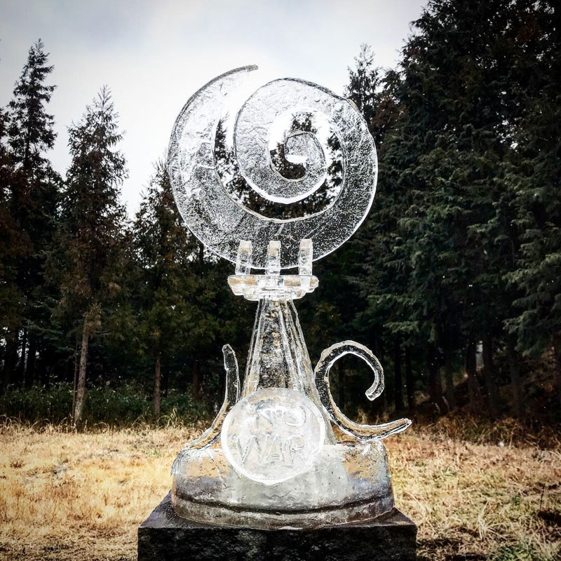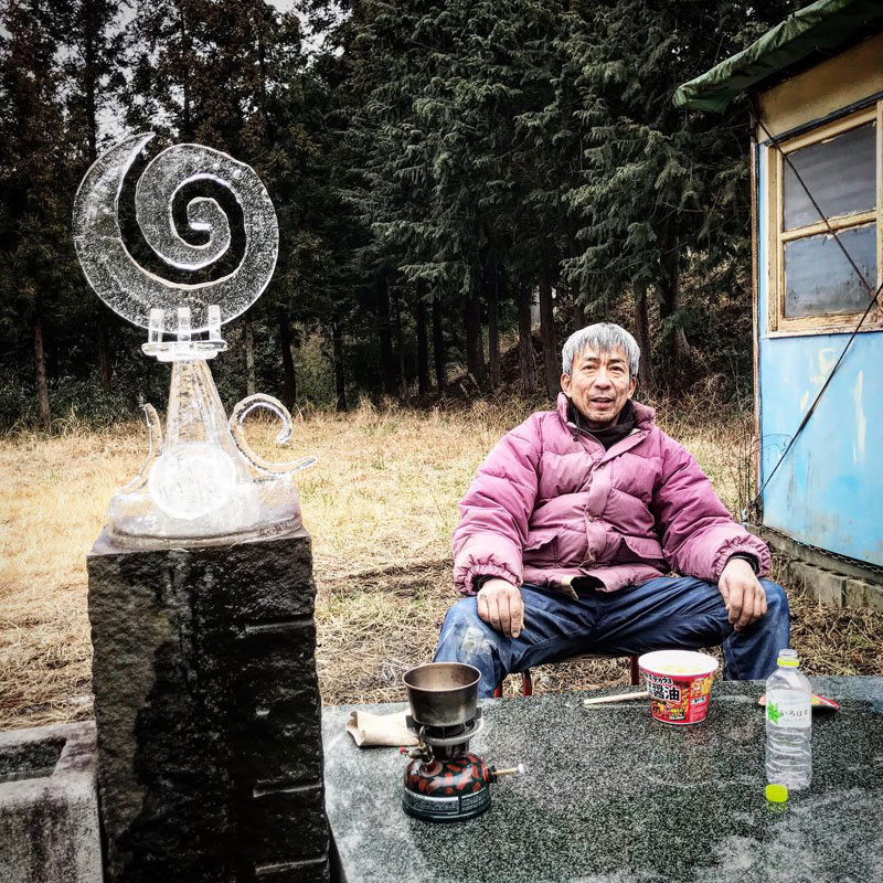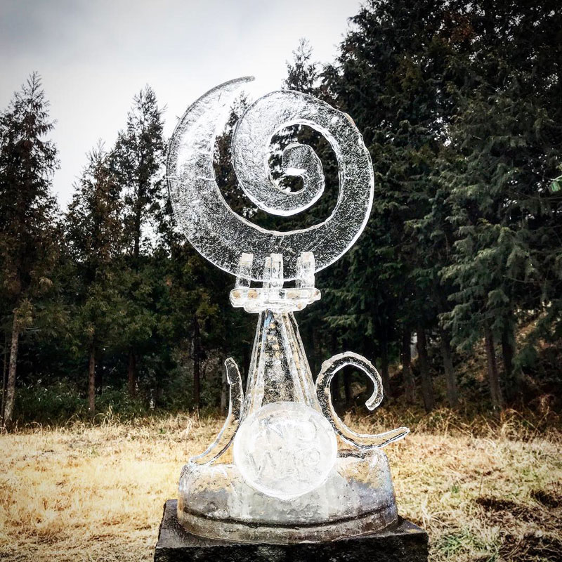 ブログを御覧いただいている皆さんにだけメイキング(笑)五角錐の塔部分は高さと幅を揃えないと組めないのでドラム缶の分厚い氷にチョークで製図。極寒で氷がガチガチなのでチョークで書ける。