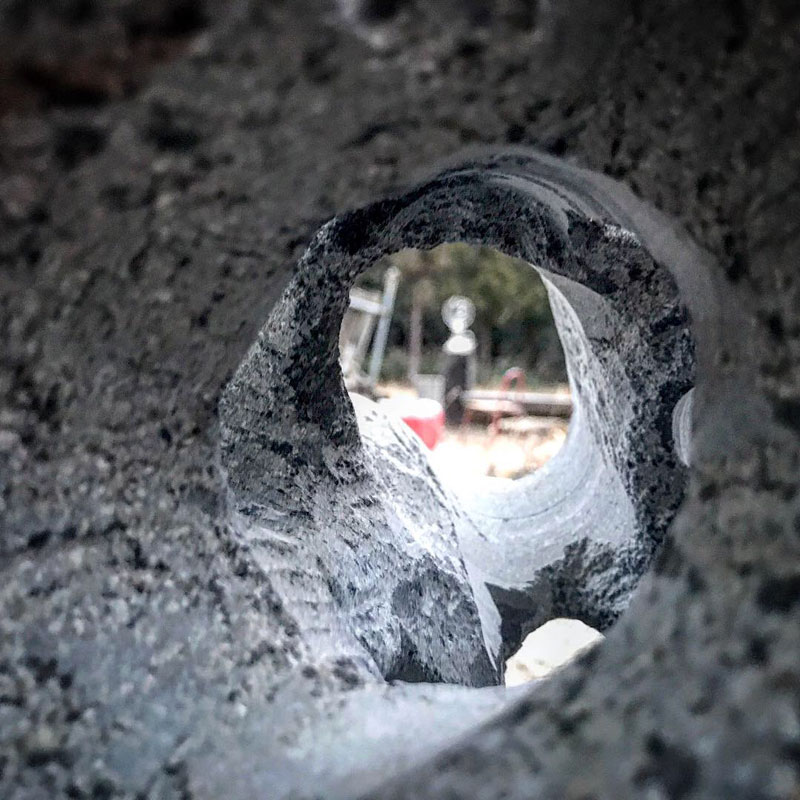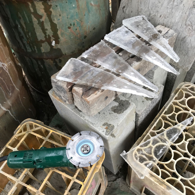 石を切るグラインダーでカット。氷の下は水なのでこんな寒い日にグラインダーで巻き上げられた水を浴びてしまうよ!