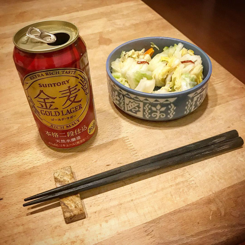 2杯目は金麦 ゴールドラガー。自家製白菜漬けをあてに。