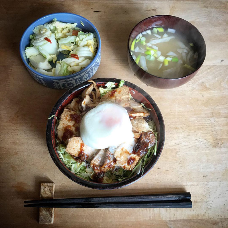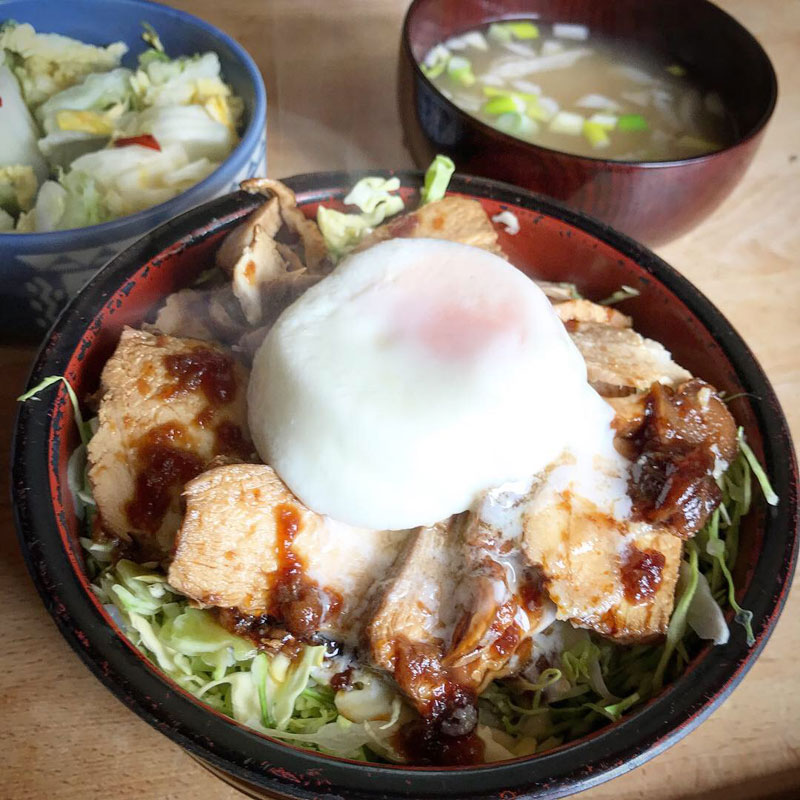 ご飯の上に千切りキャベツたっぷり。鶏肉の土鍋煮と半熟卵。鶏を煮たたれをかけて。