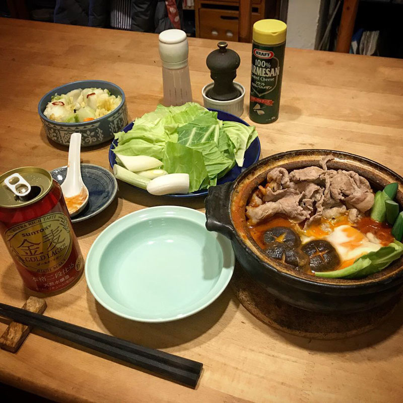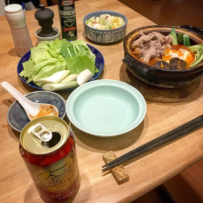 もちろん自家製白菜漬けも。赤い鍋に赤い金麦が合う。金麦 ゴールドラガー美味しい!箱買いした。