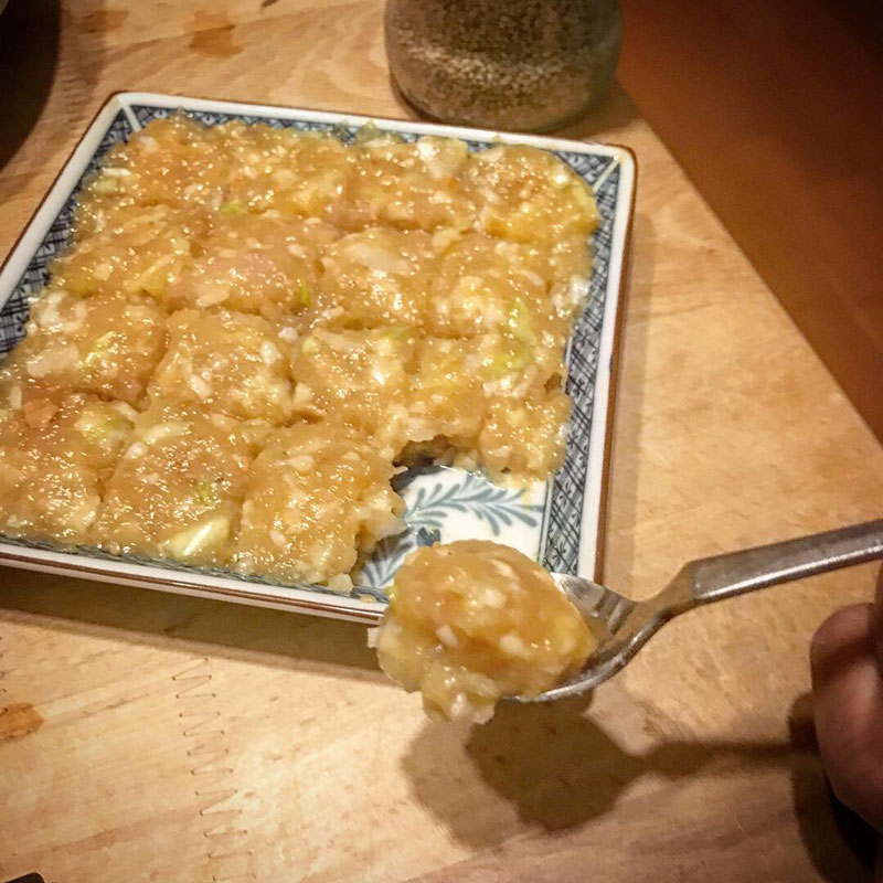 レシピは毎回適当だけど今日は、鳥の挽肉に山椒、味噌、長ネギ、卵黄を入れて粘り気が出るまでよく練って少し寝かせる。