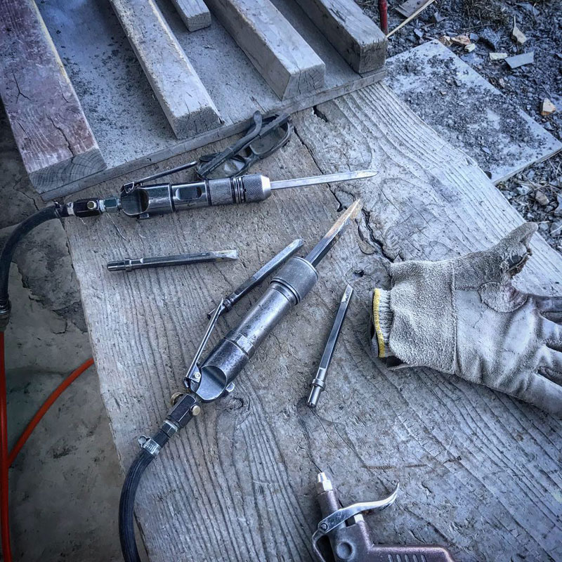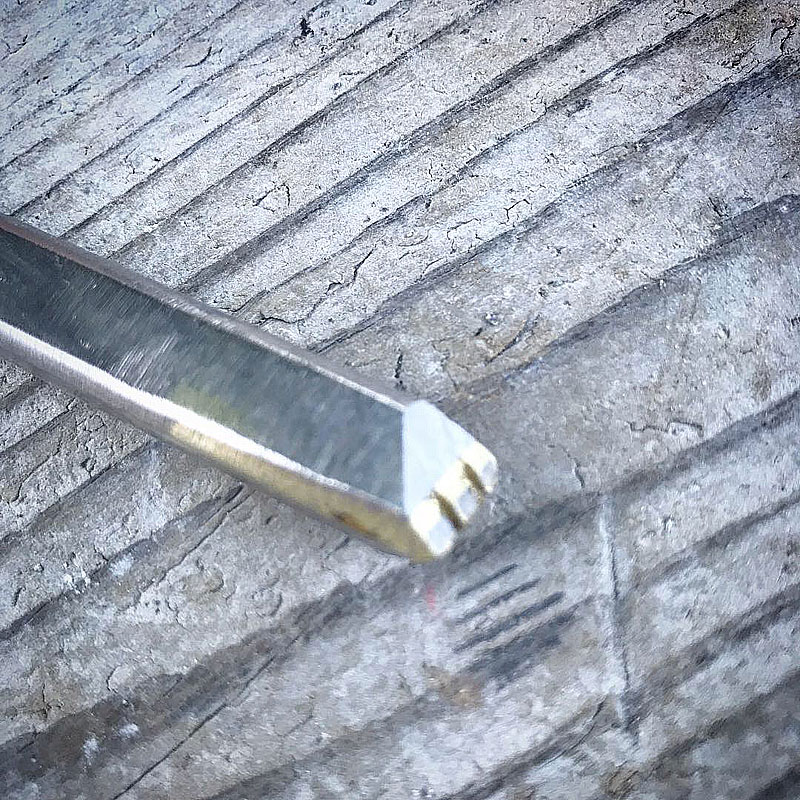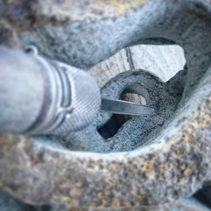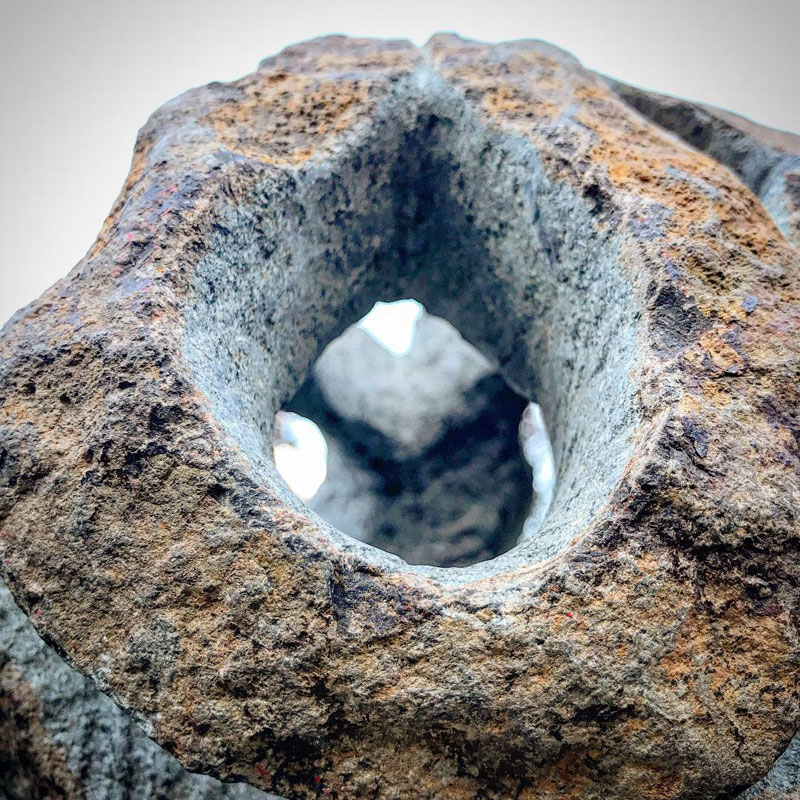 細い穴を通してノミを挿し向こう側の穴の内側を彫る事をあちらからこちらからやって、穴が少しずつ大きくなってノミの可動域も増えまた別の穴から挿して彫り、と知恵の輪を解いているような制作だった。