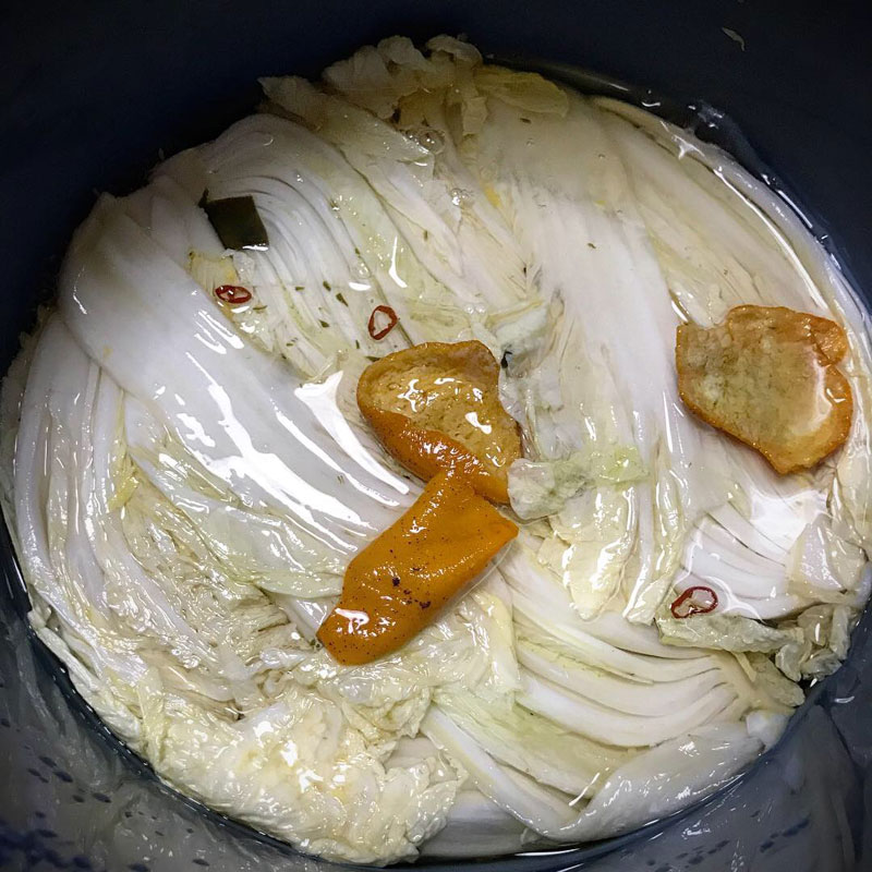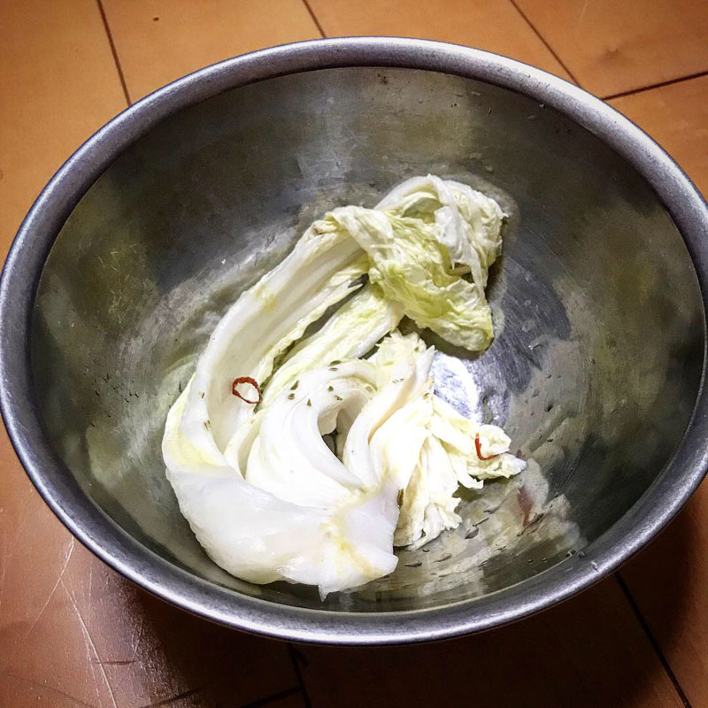 昨日の午後、漬けた白菜。無事水が上がった。なんなら今晩からもう食べられる。白菜漬けは漬ける前に白菜を干した方が美味しいってよく聞くし、いろんなレシピでも半日、天日干しする、とか陰干しするとか書いてあることがほとんどなんだけど、全然そうは思えない。いろいろ試したけど干さないでそのまま漬けた方が断然美味しい。僕はね。水もすぐ上がるし。