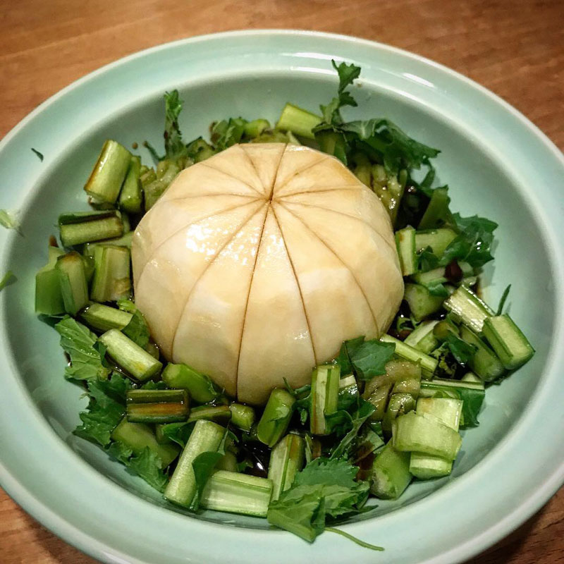 試食。大丈夫だ。サラダみたいで茎が甘い。