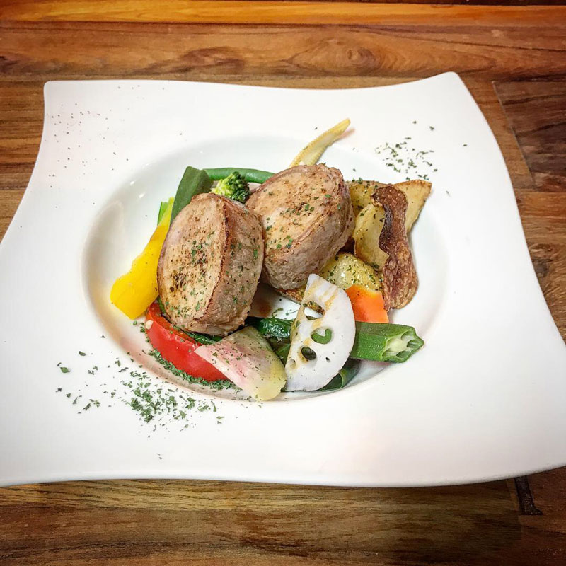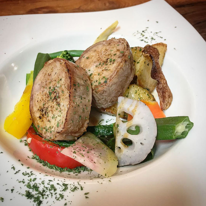 豚肉のルロー。ルローはフランス語でロールの意だそう。豚肉の挽肉を豚肉で巻いて輪切りにしたものに焼き目をつけたもの。餃子をイメージしたオリジナル料理。一口口に入れた時の口中に広がるジュースと香り。うわっ!びっくりした。付け合わせの野菜のひとつひとつも美味しい。美味しかったなぁ。食べ終わるの残念だった。