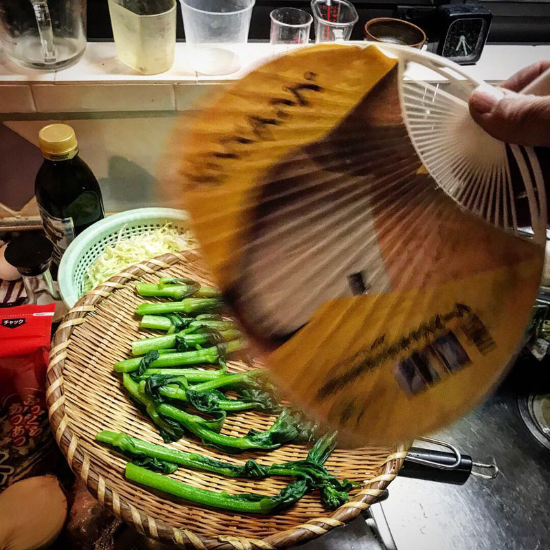 歯応えの残る丁度良い時間茹でてざるに広げたらうちわで急冷、美味しさを保つ。