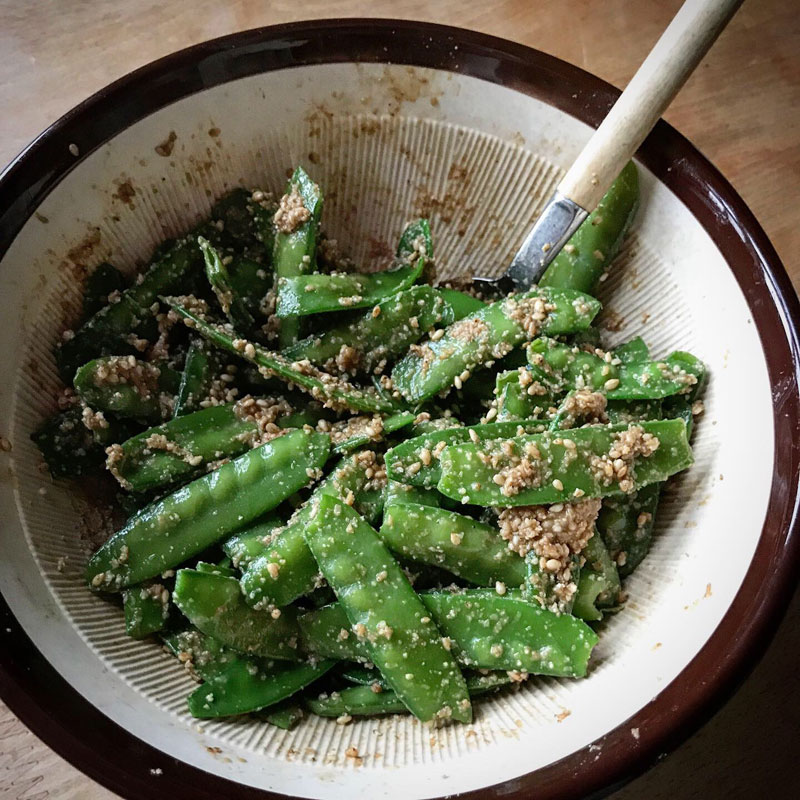 昨日、茹でた絹さやは胡麻和えにした。