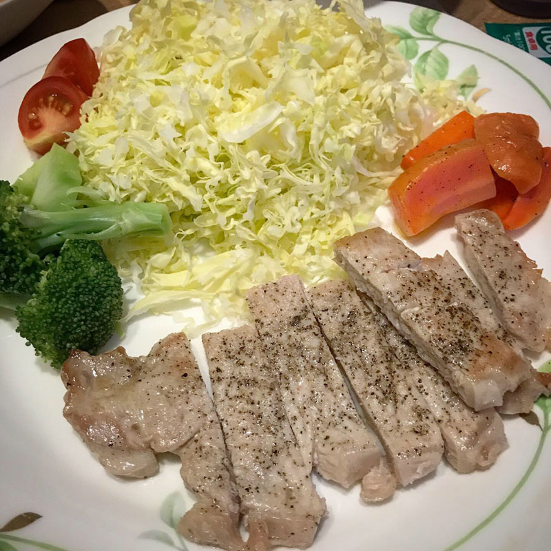 居酒屋我家、開店。ポークソテー。魚や肉を焼くの名人のカミさんのおかげで安くてごちそう。