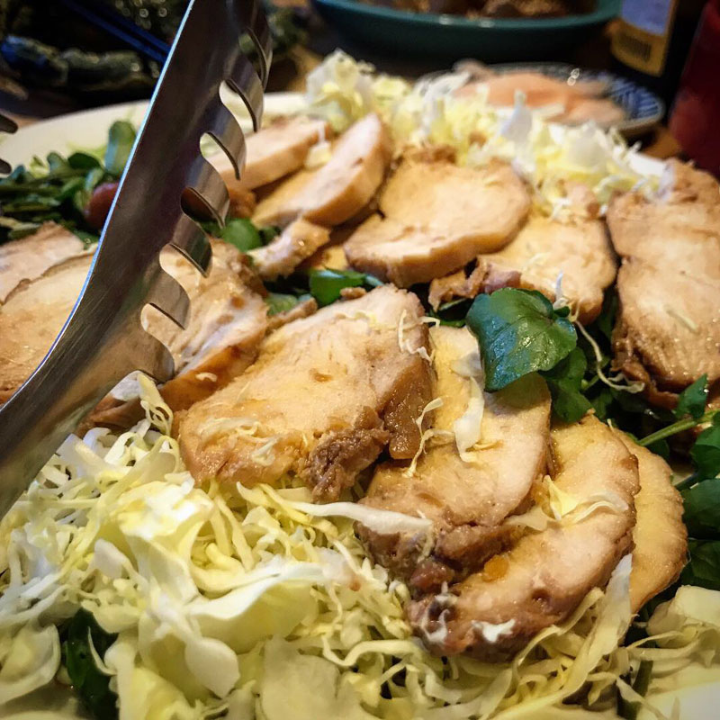 鶏肉の土鍋煮、温泉で買った蔵王のクレソン添え。