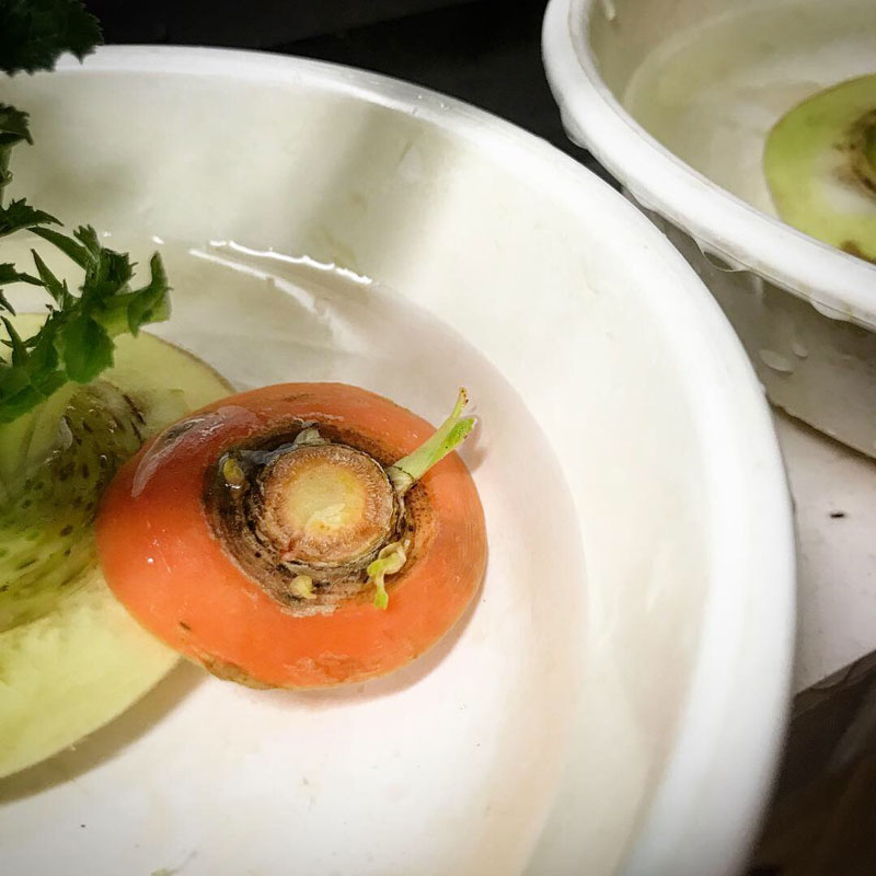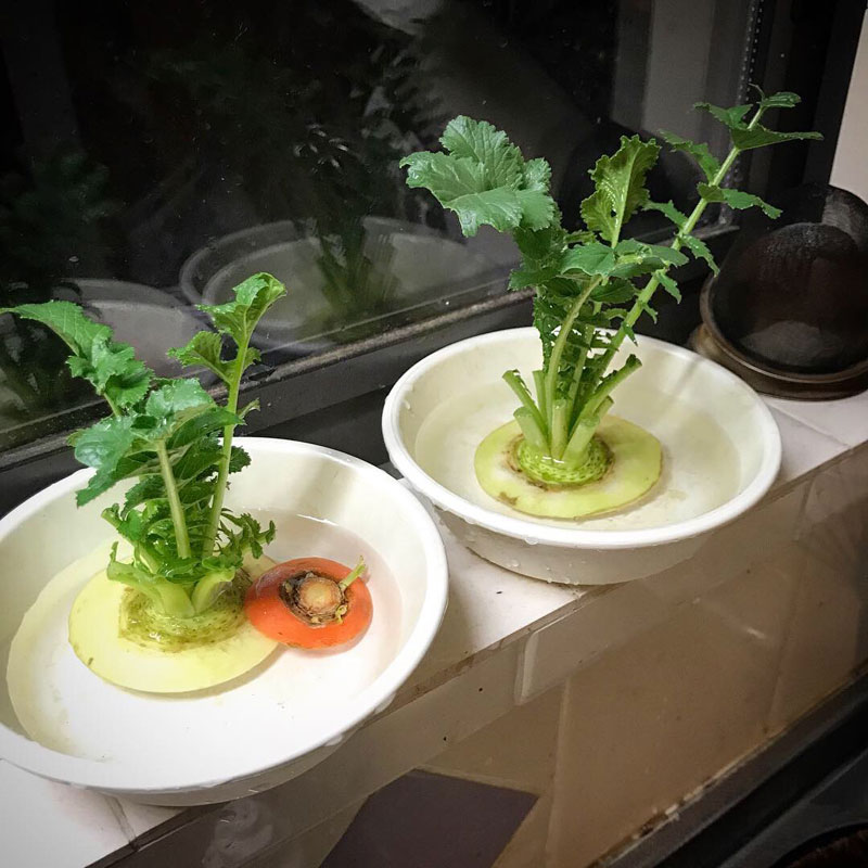 台所でカミさんが水栽培してる大根葉。