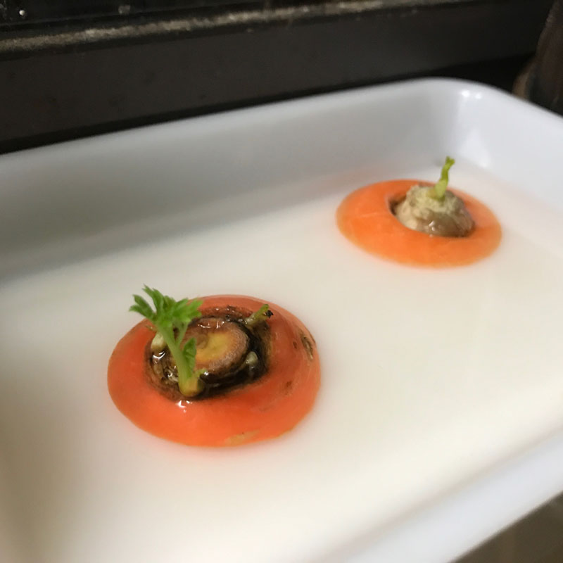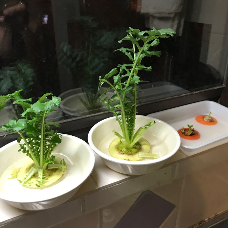 カミさんの大根と人参の切り落とし水栽培。大根葉、どんどん伸びる。