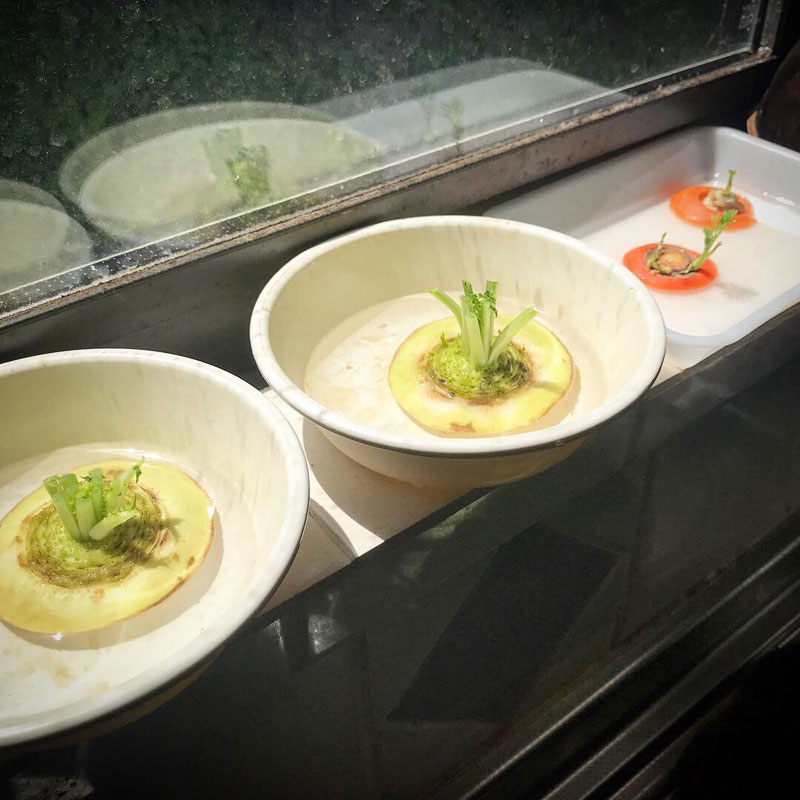 カミさんが台所で水栽培してる切り落とし大根とニンジン。昨晩の様子。