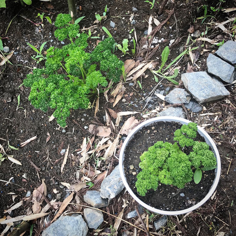 同じ時に植えたパセリ。地植えと鉢植えでもうこんなに差が出てるけど鉢にも植えておくと冬は室内に入れて一年中使える。