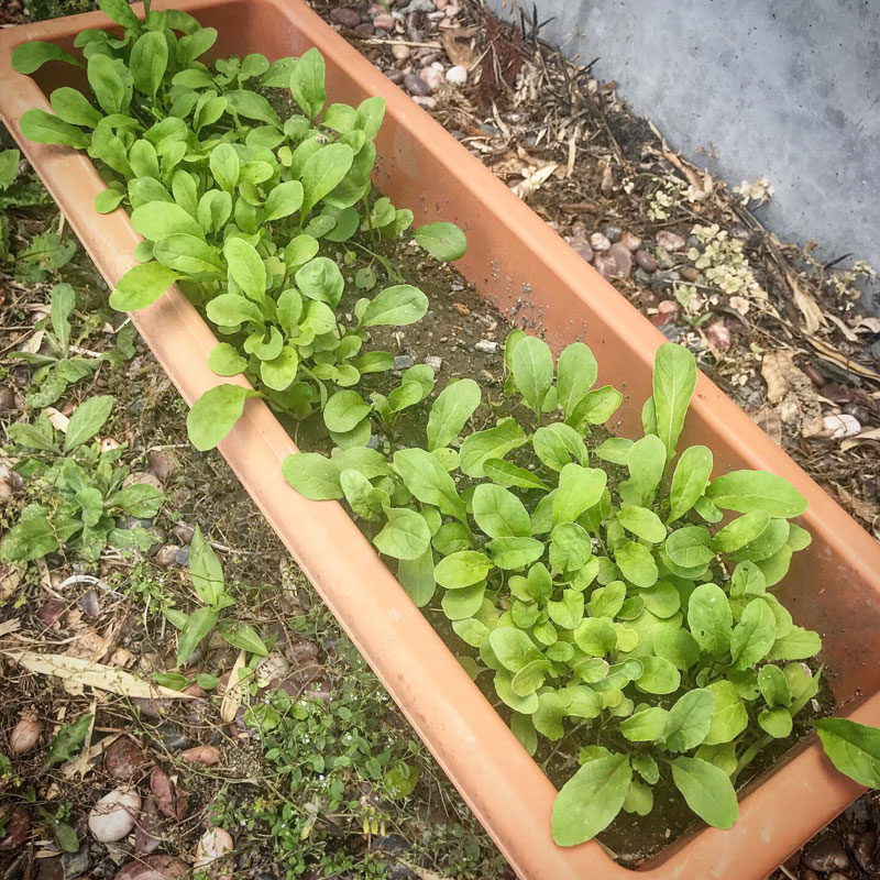 プランターのルッコラは地植えのより少し小さいけど畑のは大きくてもどんどん虫にも食べられてる。プランターはきれいなまま。