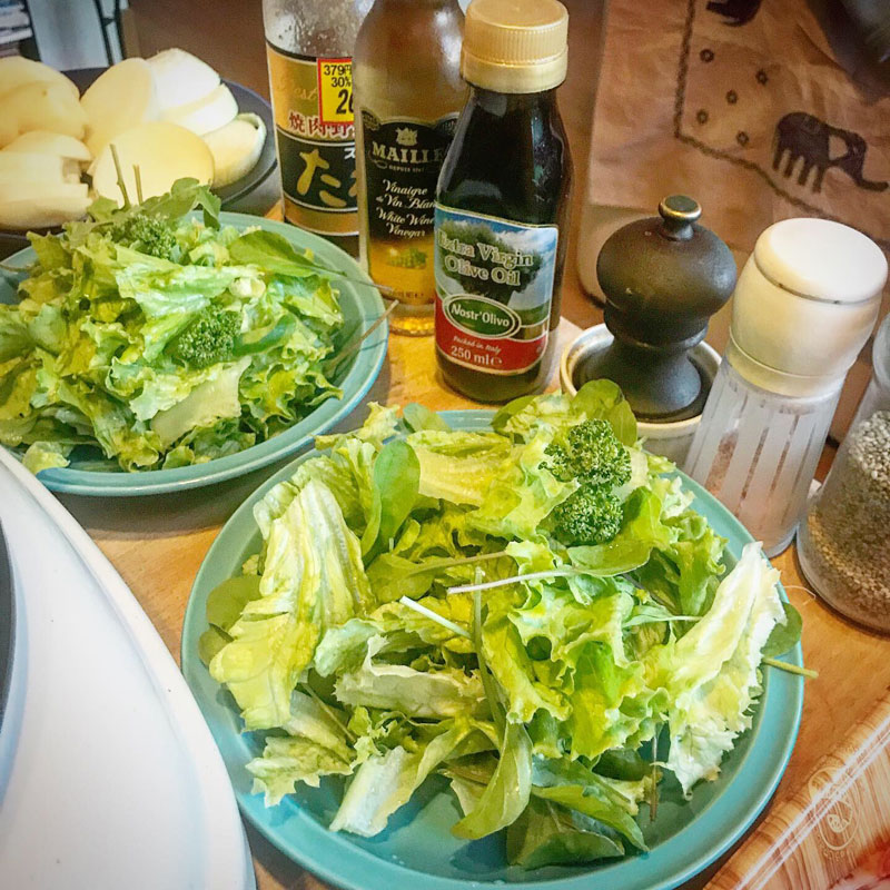 レタスもいただいたもの。庭の畑からルッコラ摘んで追加した。いただいた新鮮野菜ばっかりの夕食でした。