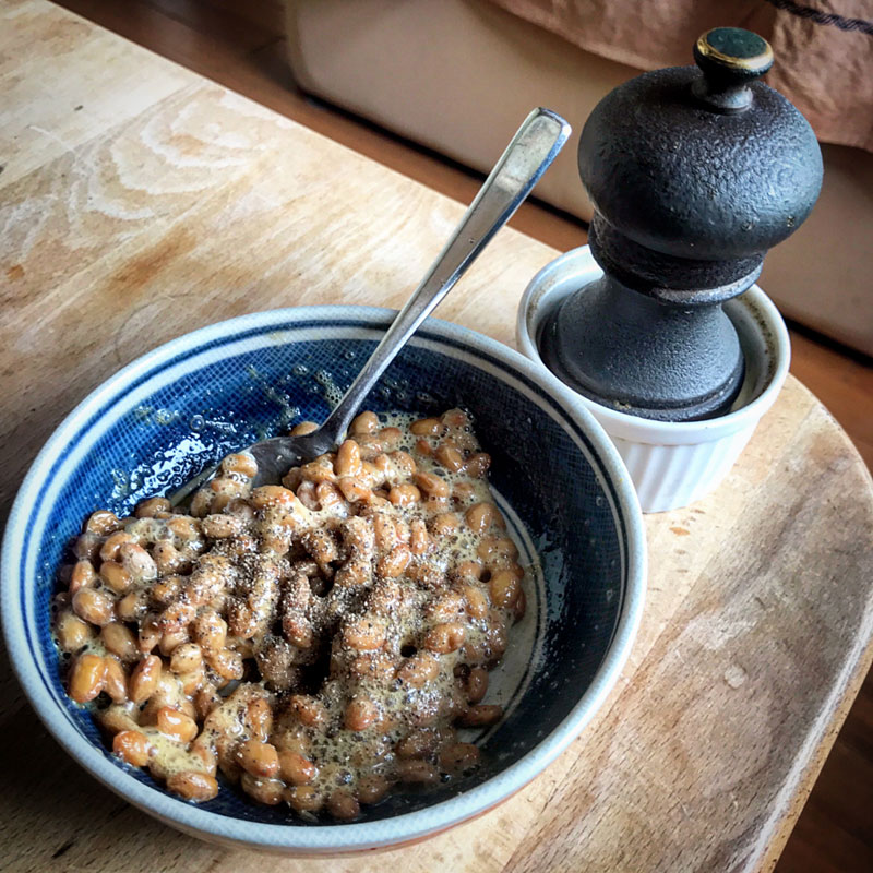 今日の納豆アレンジは黒粒胡椒。んー、ガラムマサラや山椒には負けてる(苦笑) でもこれもありだよ。