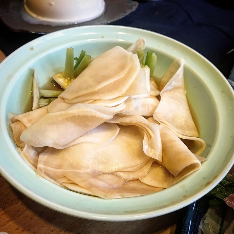 カブを水平にスライスして夕食の準備の間に醤油にさらっと漬けて浅漬けにしたもの。