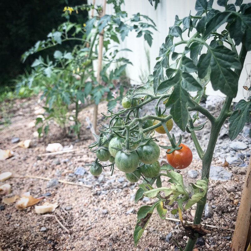 猫のトイレにされて困っていた砂地のミニトマト。切ったにんにくを並べたら効果てきめん。