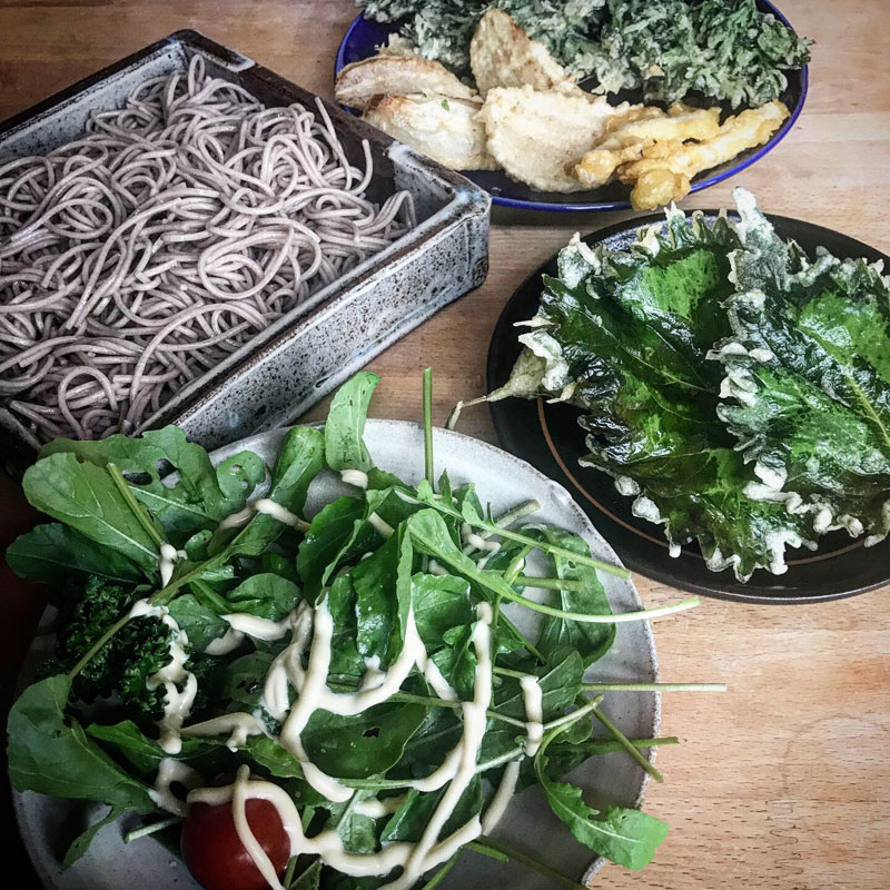 ざる蕎麦、ルッコラのサラダで昼食。春菊の天ぷら美味い!大葉の天ぷら美味い!!
