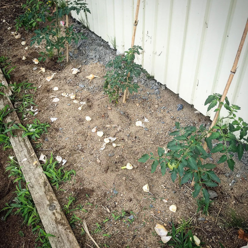 トマトは水はけが良い砂地に植えてあるんだけどそこを猫がトイレにして毎日糞掃除。にんにく敷いてみる。
