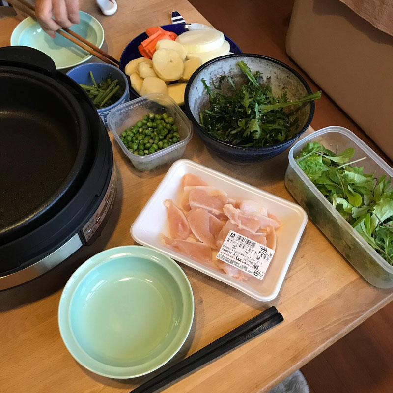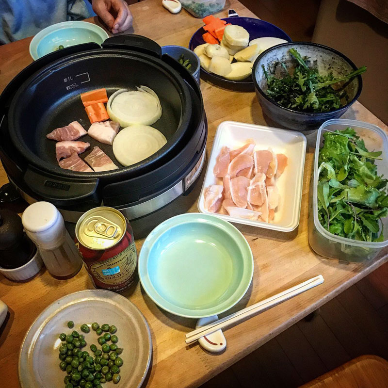 居酒屋我家、開店。焼き物。鍋でも焼き物でも頻繁に登場するの電気のグリル鍋、長年使い過ぎてコンセントプラグが熱を持つようになってしまったのでクレジットカードのポイントで新調したグリル鍋のデビュー。