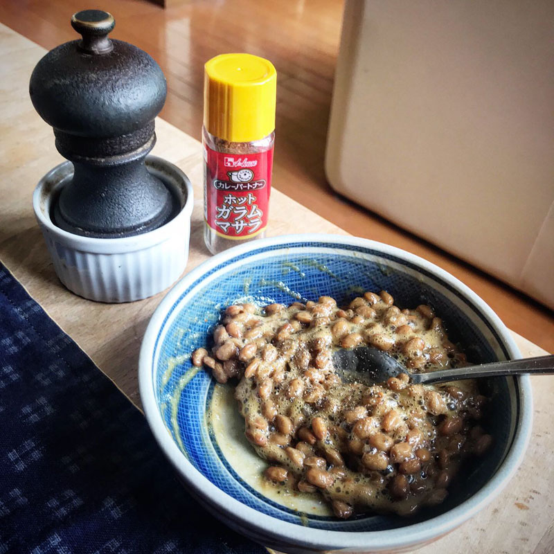 本日の納豆はガラムマサラ+黒粒胡椒を挽いて。