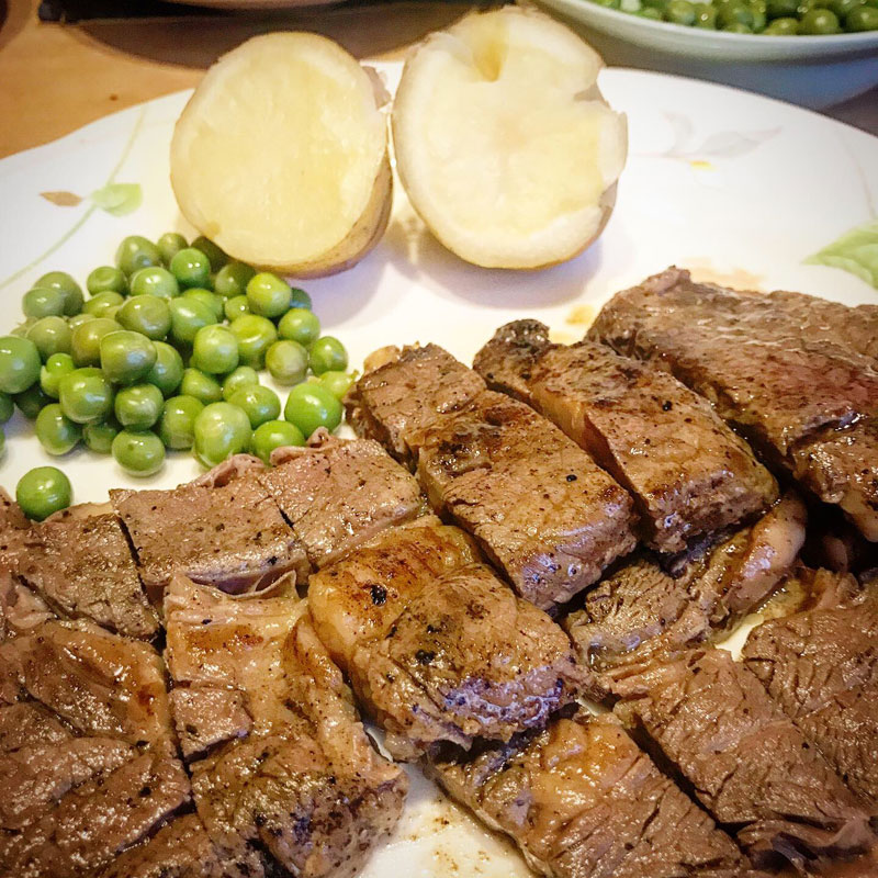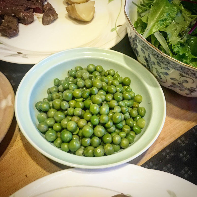 ただ塩茹でしただけのグリーンピースと蒸した新じゃがが添え物と思えない美味しさ。