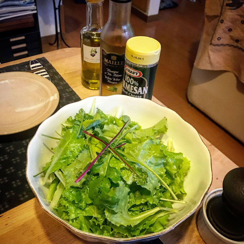 畑のベビーリーフとルッコラのサラダ。