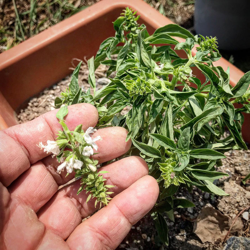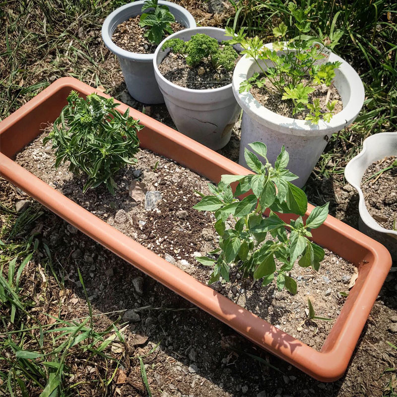 プランターに植えた2種類のバジルはいつも食べてるスイートバジルとは姿も葉の形も全然違う。